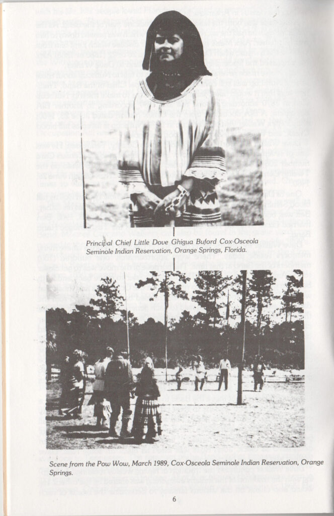 In 1992 Chief Little Dove invited me to the Green Corn Ceremony. The last ceremony of the 7-day Green Corn Ceremony was held in the ceremonial square with Seminole ancient traditional dances, songs, the partaking of the Asi (Black Drink) and a scratching. The concluding ceremony of the 7-day sacred event had Chief Little Dove and her tribal council standing behind her to the west side of the Sacred Fire. I remember very clearly listening to birds and the insect sounds of the Florida Everglades, smelling the mixture of the jungle and smoke from the Sacred fire, when suddenly Chief Little Dove commanded me to enter the center of the Sacred Square where she guided me to stand at the East of the fire with her and the Tribal Council standing at the West. I remember feeling very perplexed, as I stood in front of her and the tribal council.